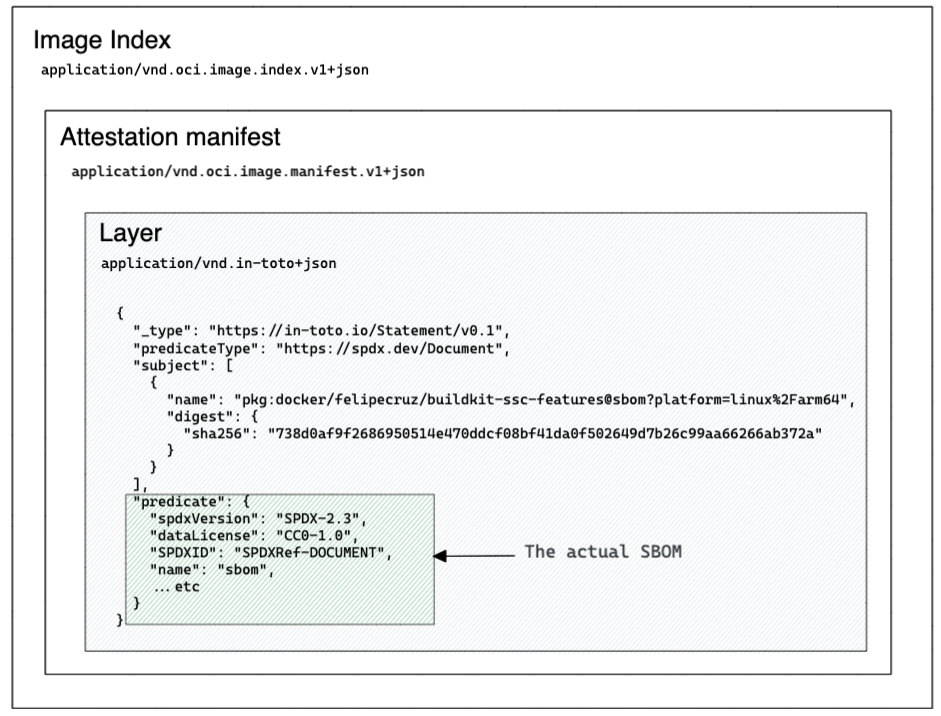 The important discovery for me was that BuildKit won't output the SBOMs and SLAs as some other tools could do, but they are wrapped inside in-toto attestations and, attached as manifests to the image root index.