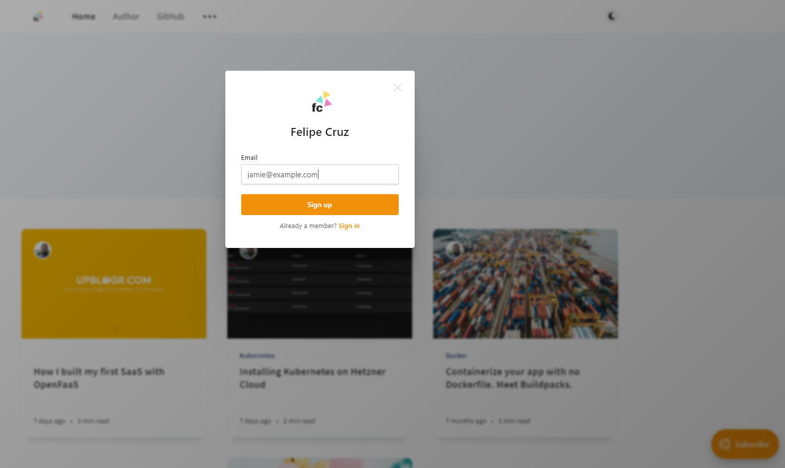 ... ommited lines ...Finally, you can try out if the email newsletter functionality has been set up correctly in Ghost. Go to your Ghost site and subscribe any email address by clicking on the Subscribe button: