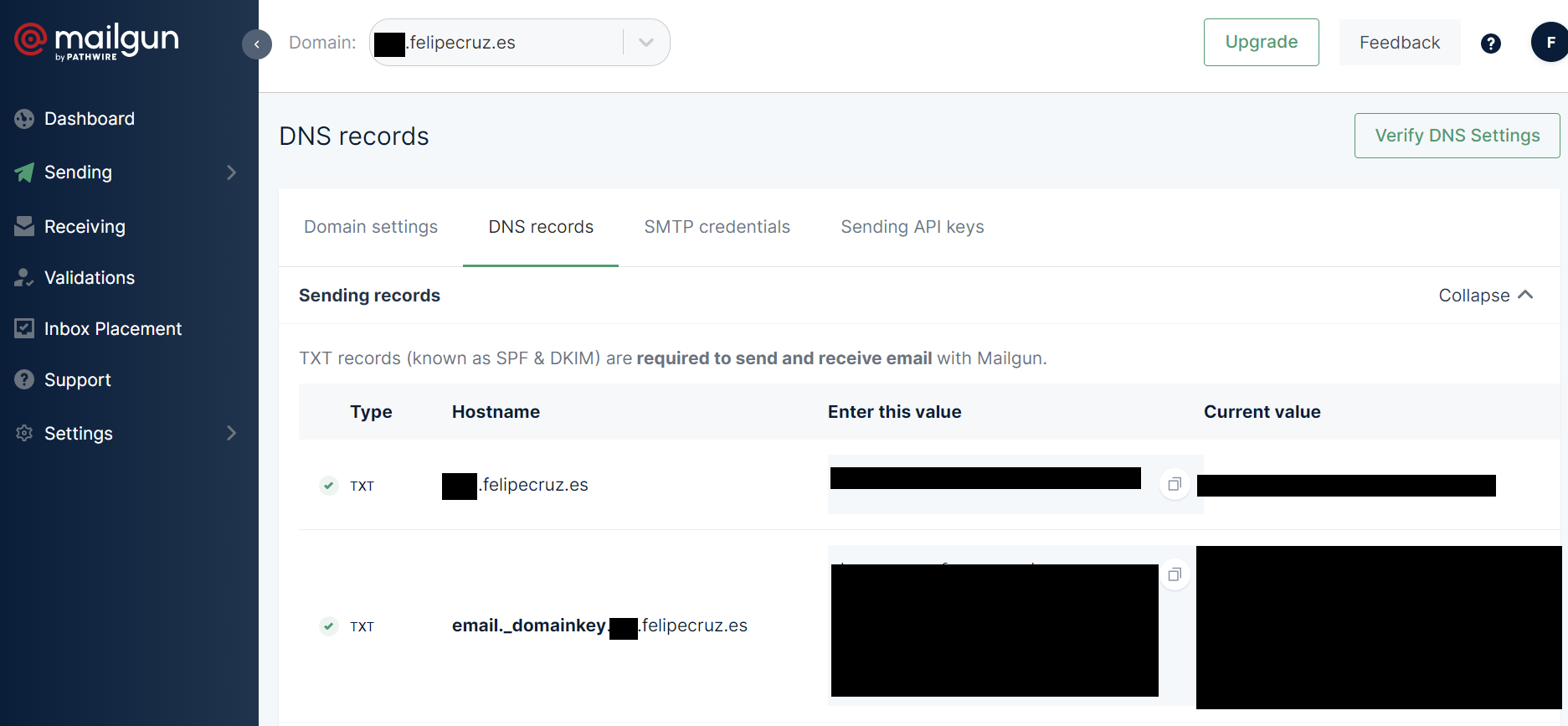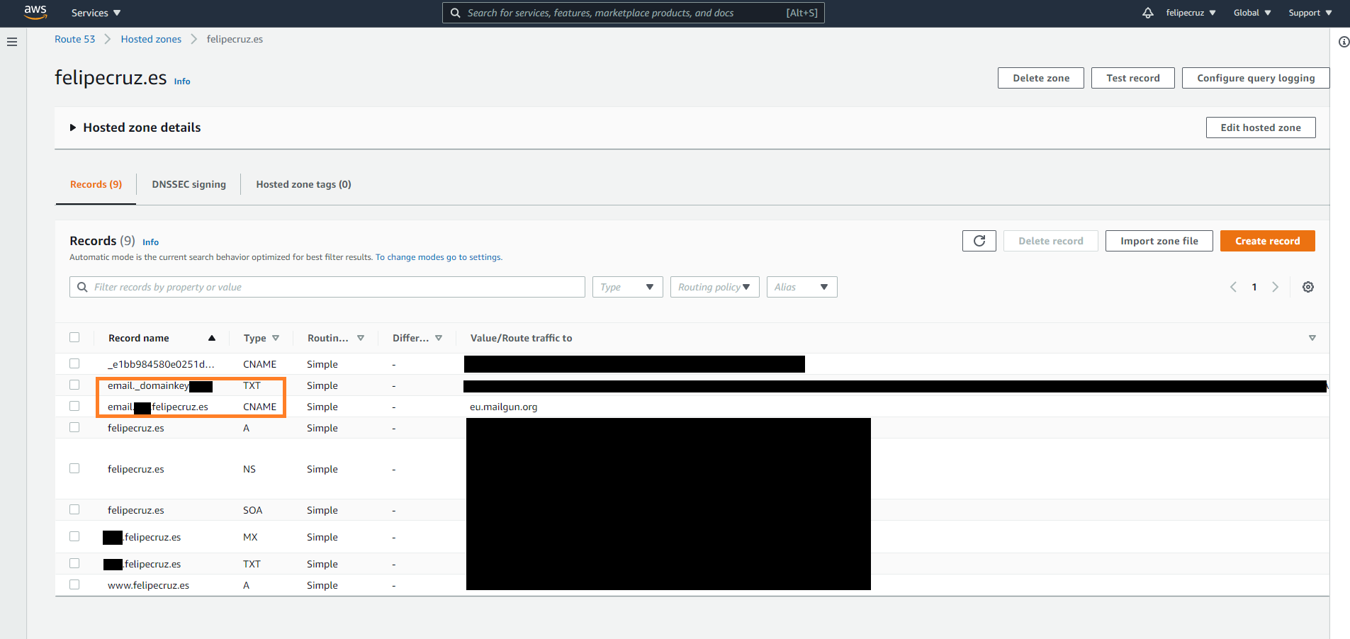 As I'm using AWS, I have a Route 53 named felipecruz.es where I have added the DNS records that Mailgun displayed in the set up page.