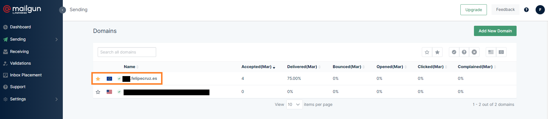 In my case, I created a new Mailgun domain in the EU region under my main domain felipecruz.es. For instance, mg.felipecruz.es or mail.felipecruz.es could be valid Mailgun domains.