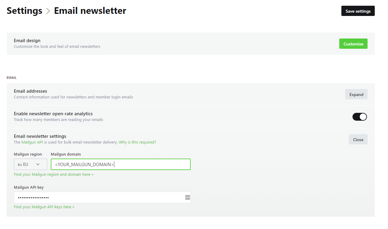 Configure the Email Newsletter settings in Ghost